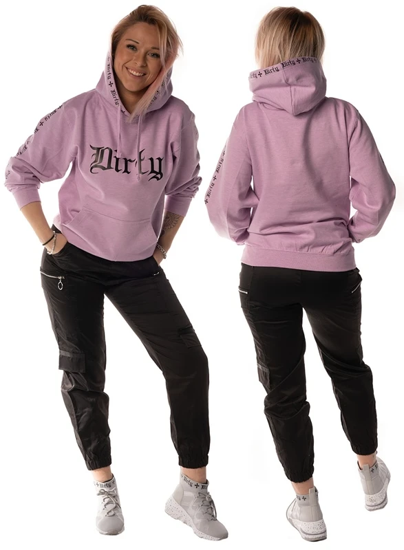 Unisex hoodie in a nice Purple color called Surf Purple. Hood with print in black all around. Dirty print on the front and along the sleeves. Large pocket at the front and sturdy cuffs at the cuffs and at the bottom.