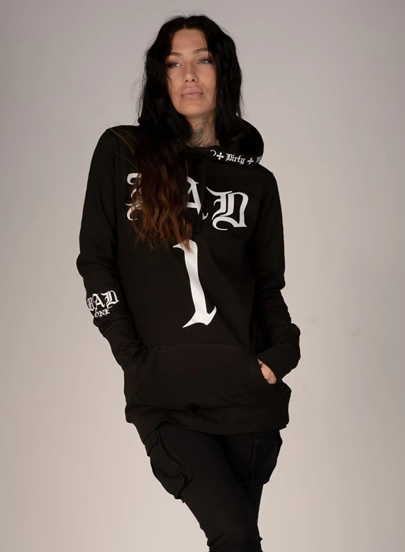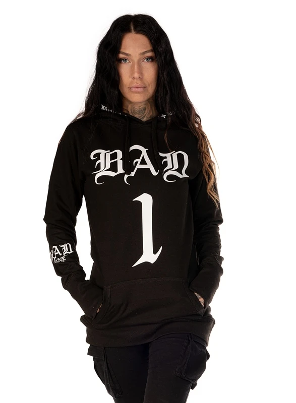 Black hoodie with Bad 1 Print on arm, hood and large in front. Slim fit.