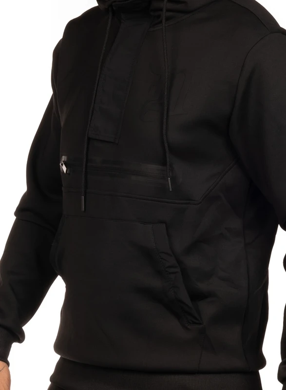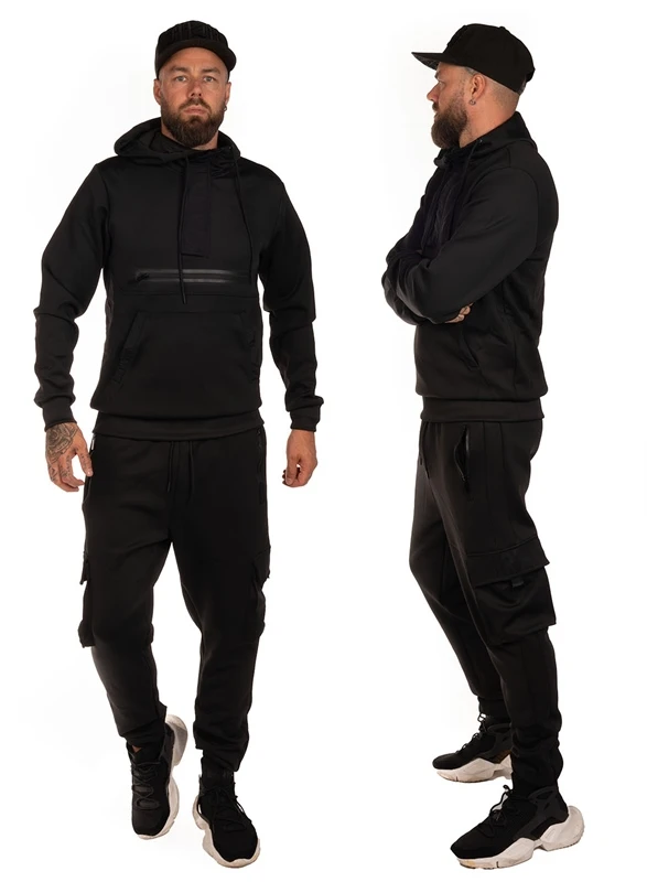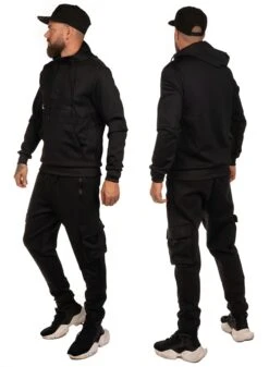 Tracksuit from Dirty in black. Hoodie with double front pockets. Cargo pants with pockets with zip and double cargo pockets. Black rubber print on chest and legs.