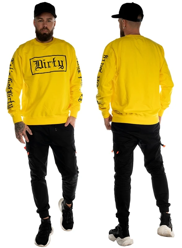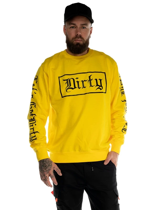 Yellow sweatshirt from Dirty with black print on the sleeves and front.