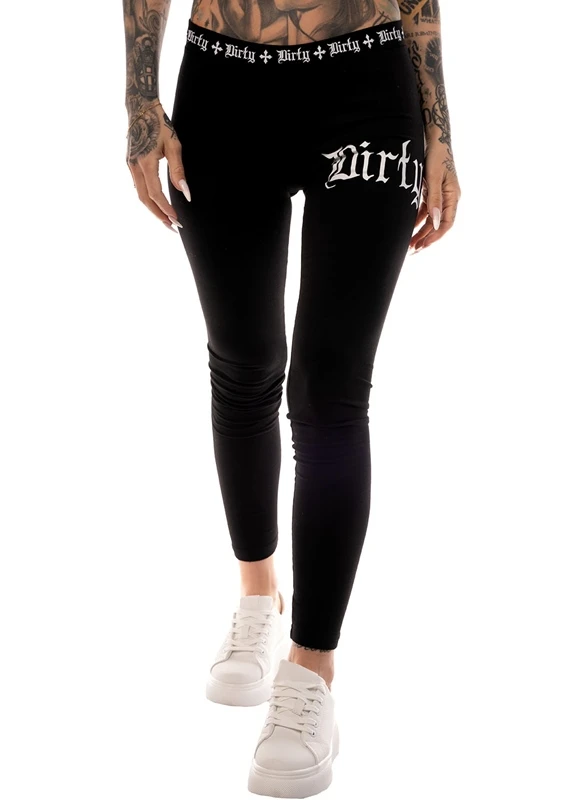 Black leggings from Dirty with white print around the waist and on the front of the leg.