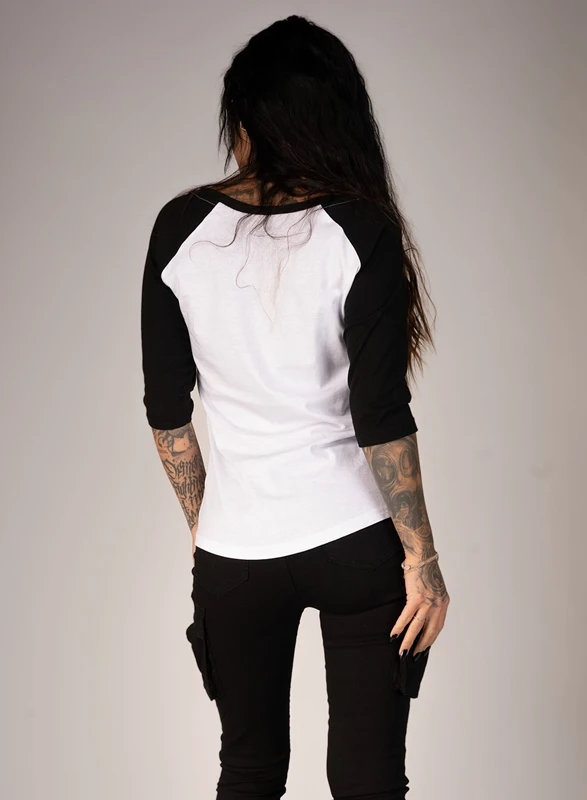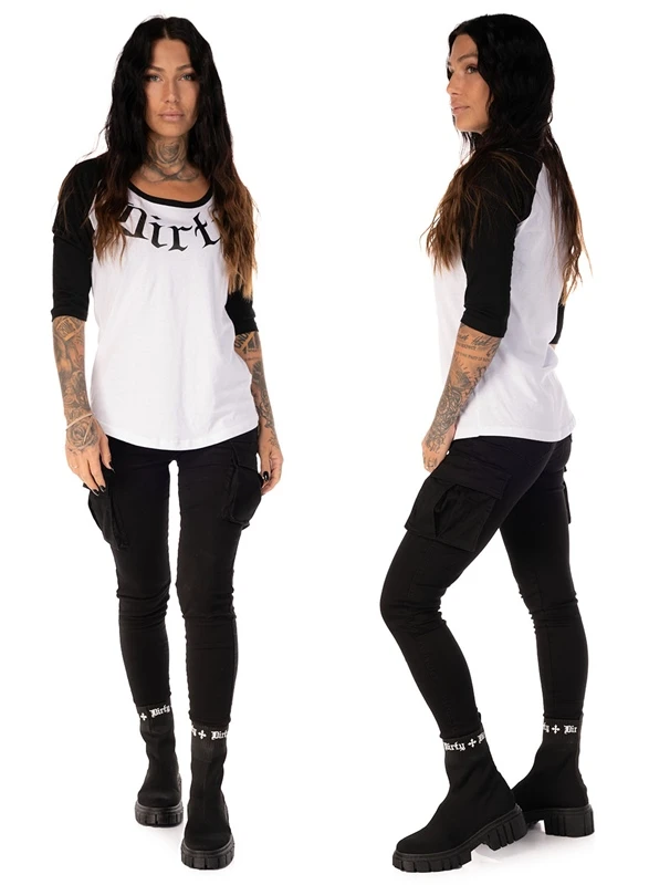 Dirty Raglan tee in white with black sleeves. Large black print on the front.