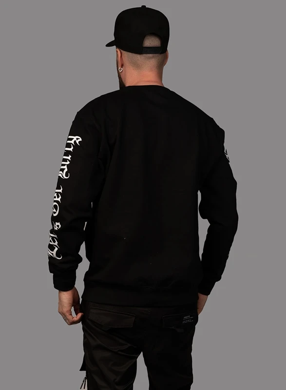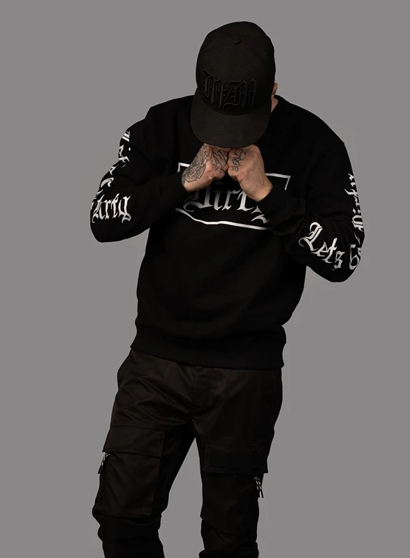 Black sweatshirt with Lets Get Dirty on the sleeves and Dirty on the chest in white.