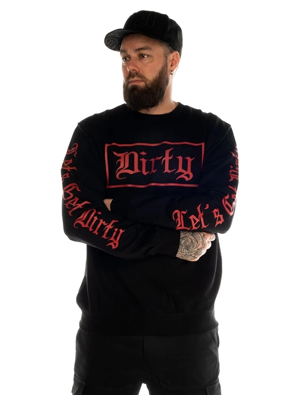 Black sweatshirt with Lets Get Dirty on the sleeves and logo on the chest in red.