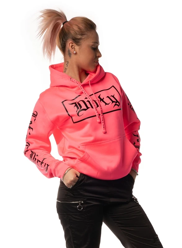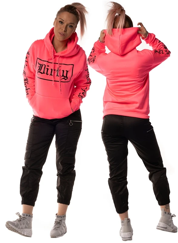 Neon Pink Unisex hoodie with Let´s Get Dirty on the sleeves and logo on the front in black. Lacing for hood in pink with black Dirty print. Really nice hoodie in another nice color combo.