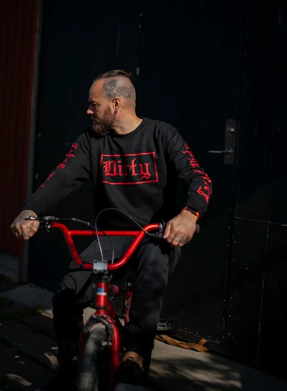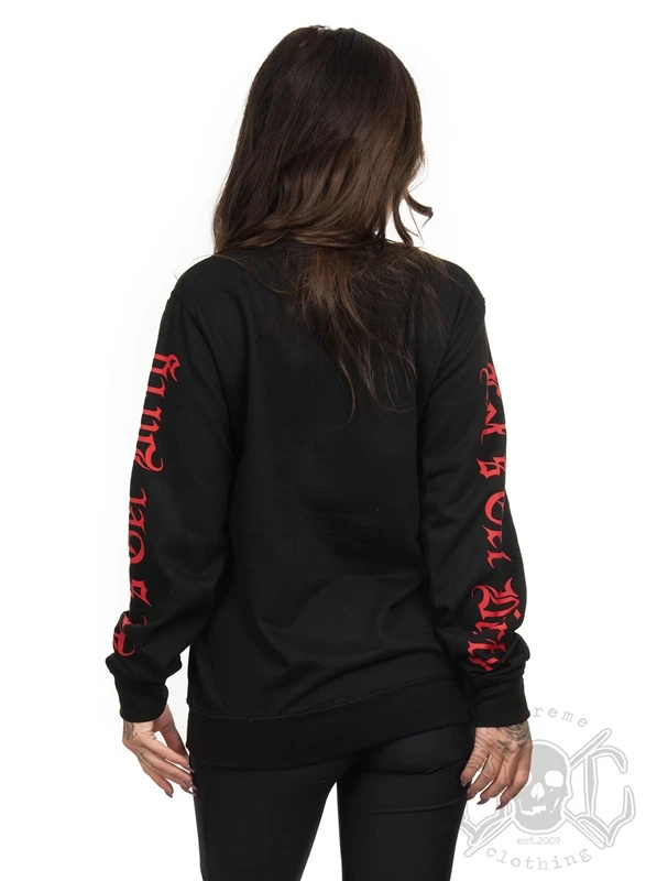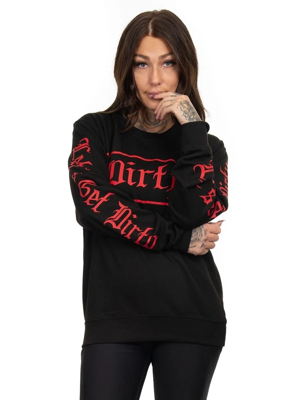 Black unisex sweatshirt with Lets Get Dirty on the sleeves and logo on the chest in red.