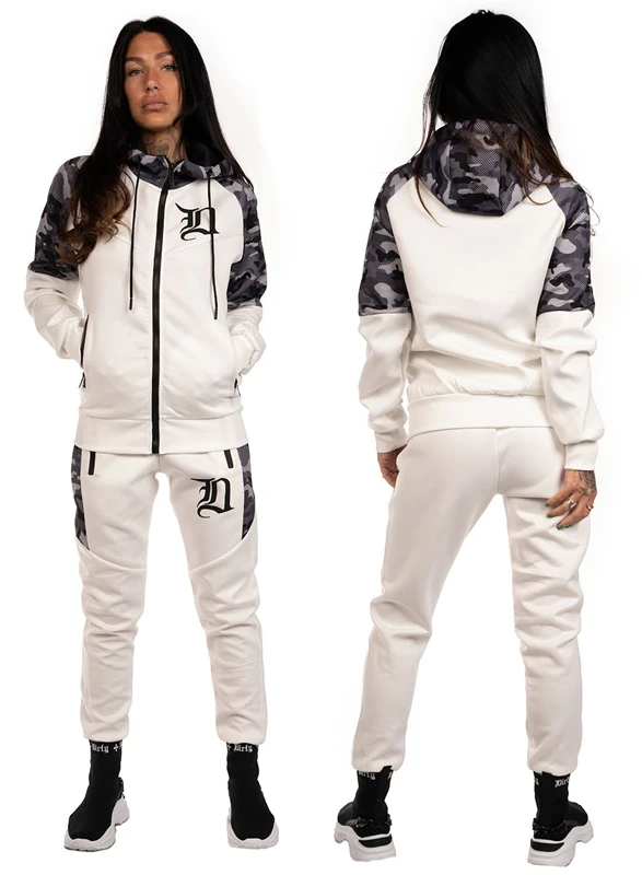 Tracksuit from Dirty in white with black N white camo details. Black rubber print on chest and legs.