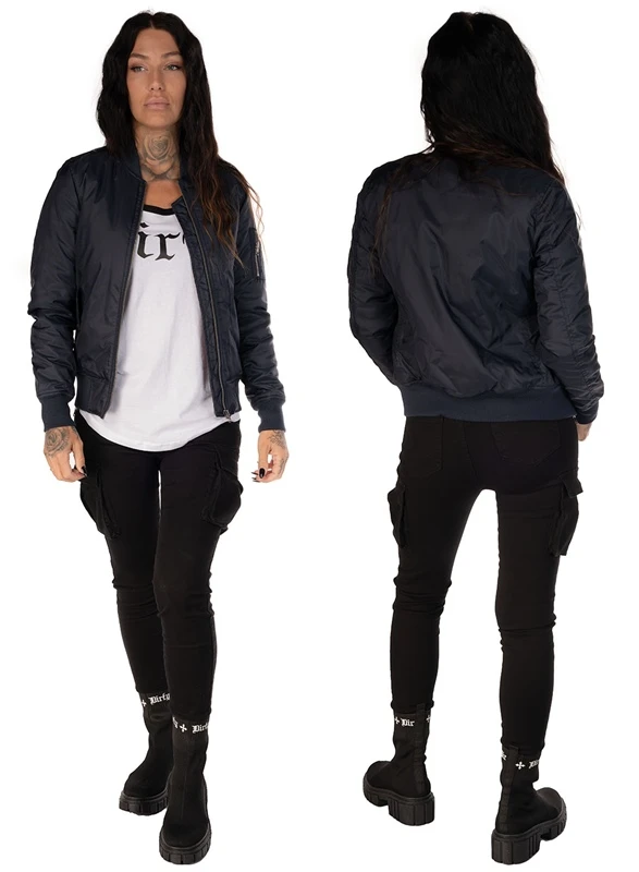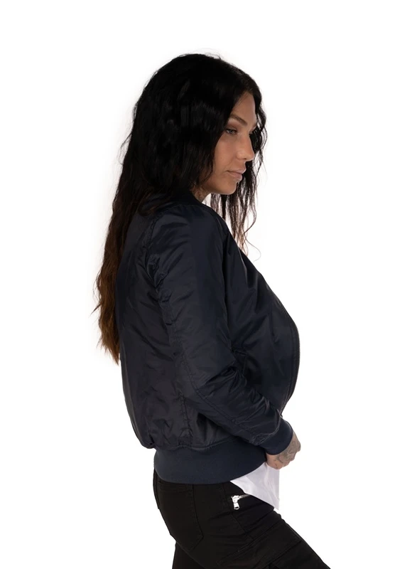Blue bomber jacket with inner lining in orange. Double pockets. Inner pocket with zipper. As well as a pocket on the arm. Slim fit jacket.