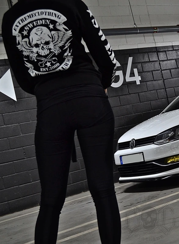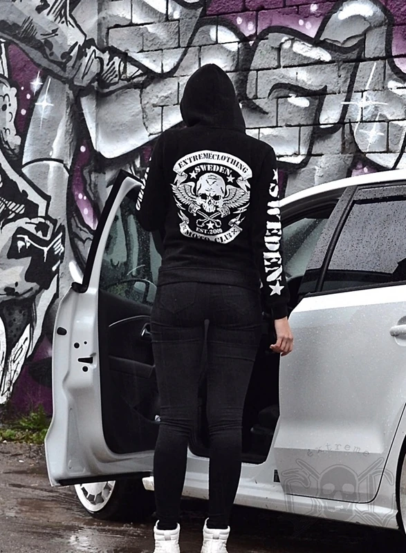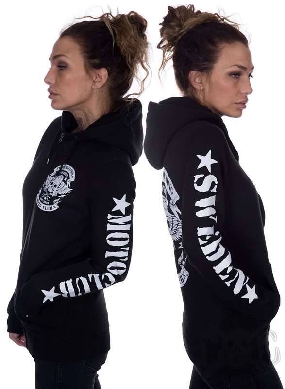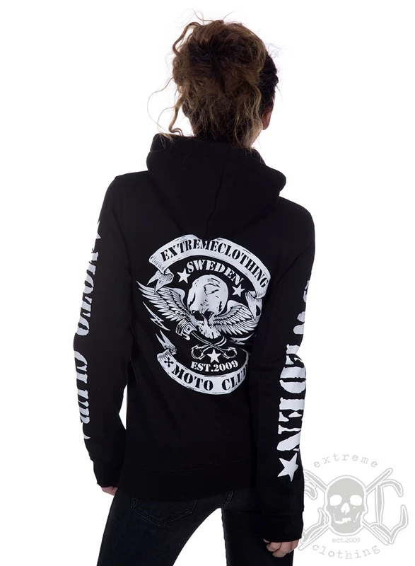 Svart dam hoodie med från EXC. Mjuk och skön hoodie med bra passform och kortare krage. Moto Club motiv med döskalle. vingar och korsade kolvar på vänster bröst, samt i större skala på ryggen. Moto club textat på ena armen och Sweden på den andra.