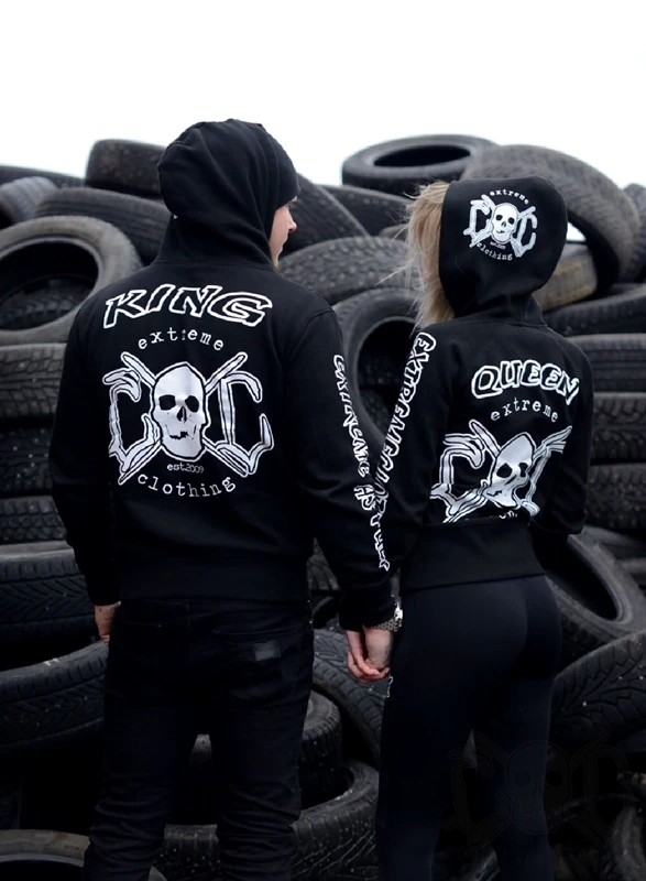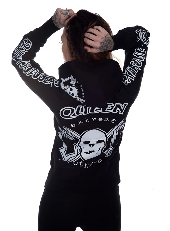 Stilvolle Dame Hoodie von EXC. Zwei Fronttaschen , elastische Bündchen an der Unterseite und an den Ärmeln für die beste Passform . Logo in Weiß gedruckt auf der Kapuze, der linken Brust, und in größerem Maßstab auf der Rückseite. „Extremeclothing“ auf einem Arm und „extreme as fuck“ auf der anderen Seite. Königin auf den Schultern gedruckt. Auch in passenden Männer. Hoodie in Top-Qualität druckt die letzte.