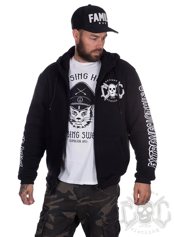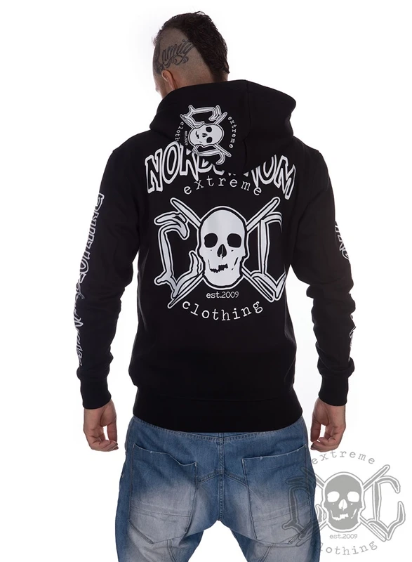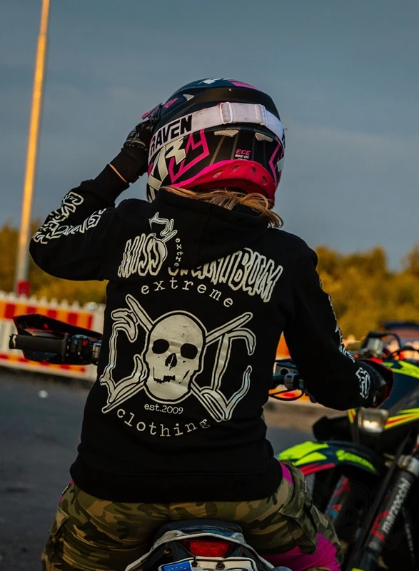 Black Kevlar hoodie from eXc with white print on chest, hood, sleeves and back. eXc Kevlar hoodie is in 100% cotton with a full-coverage kevlar cover in DuPont kevlar. The Kevlar hoodie is also equipped with CE-approved back protection, shoulder protection and armrest protection. All guards can be removed when they are mounted in pockets.